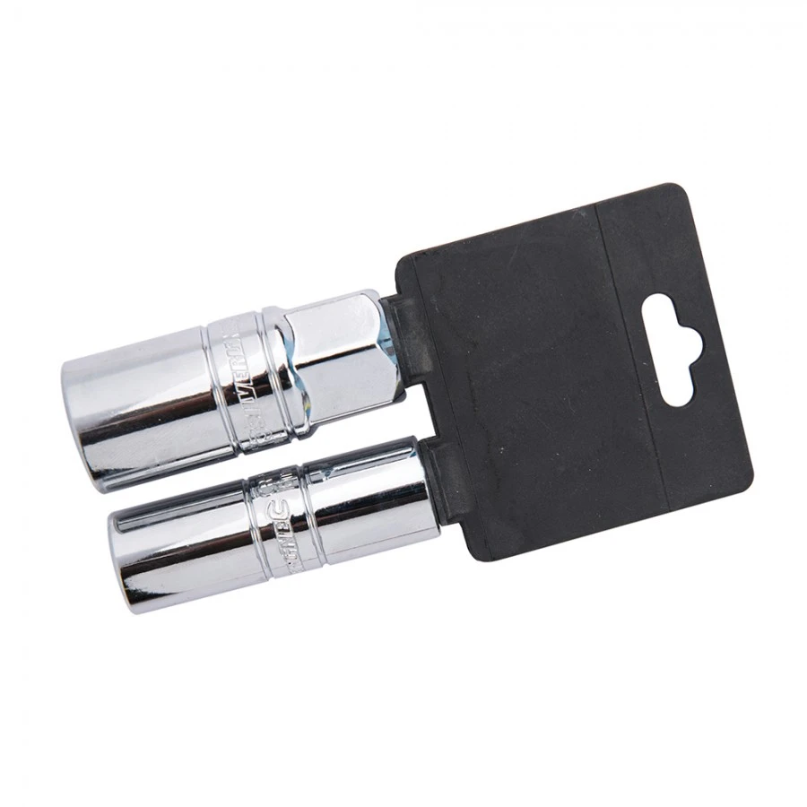 Hardened tempered chrome-plated corrosion-resistant chrome vanadium. Chamfered end for positive nut location, with rubber inserts for plug retention and protection. Includes 16 and 21mm spark plug sockets.